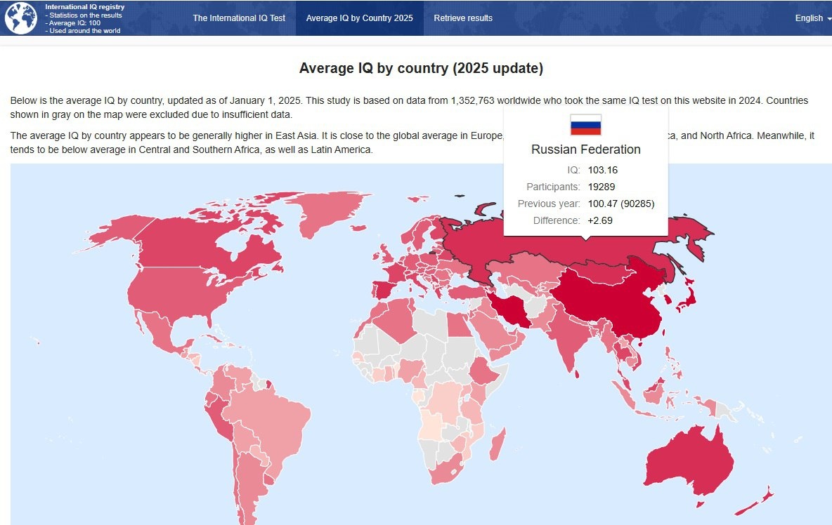 Россия вошла в топ-6 стран по уровню IQ. Первое место в рейтинге занимает Китай. Следом идут Южная Корея, Япония, Иран и Сингапур. США расположились на 30-м месте. Украина стал худшей страной в Европе по уровню IQ. Всего в рейтинге представлены 126 стран. Это исследование основано на данных 1 352 763 человек по всему миру, которые прошли тот же тест на IQ на этом сайте в 2024 году,— сказано на сайте проекта.