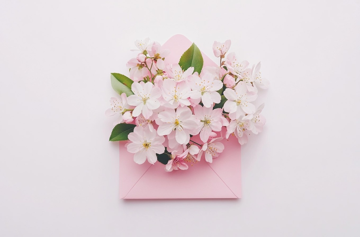 Создано на основе запроса: Beautiful spring flowers on a pink envelope, isolated on a white background, in a top-down view