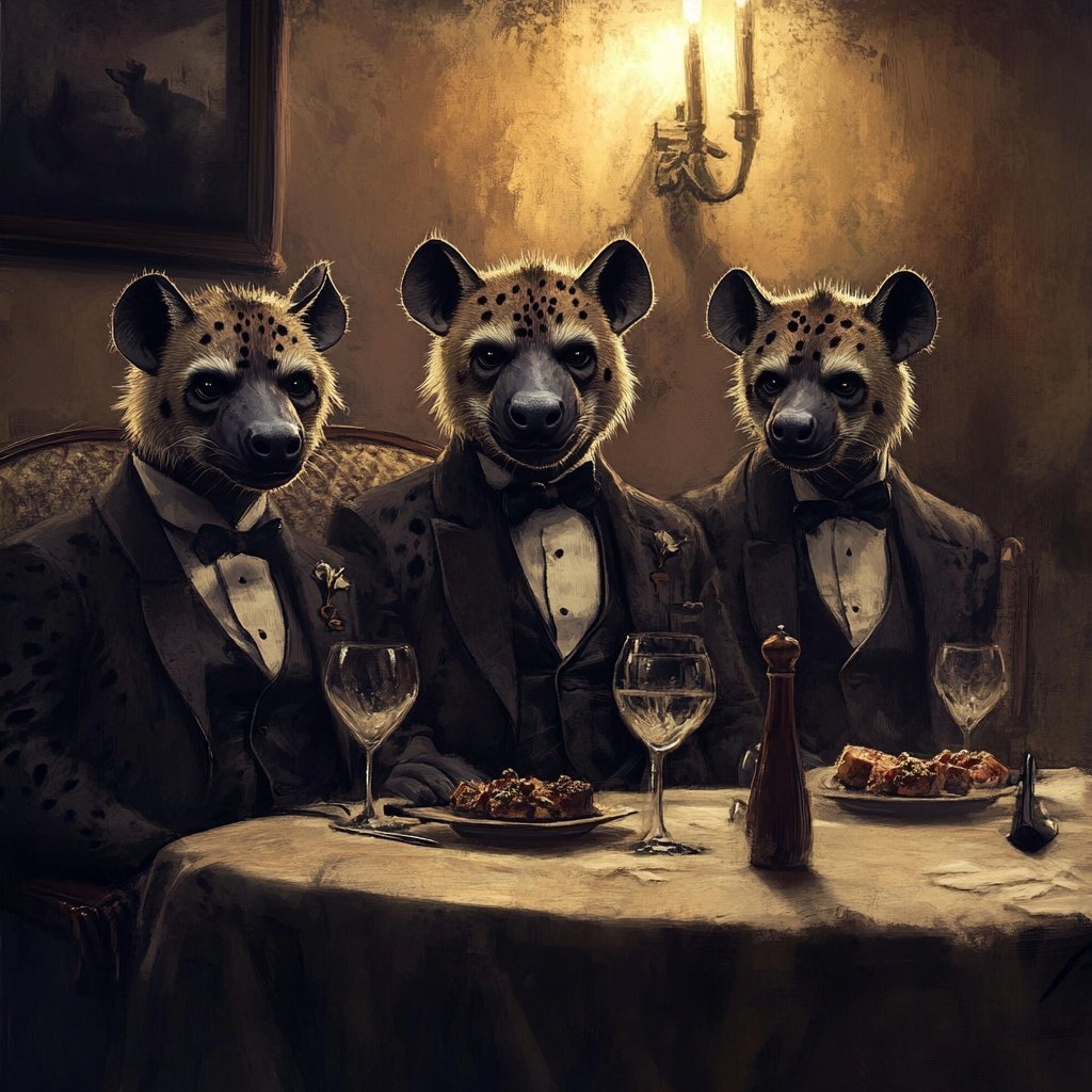 Создано на основе запроса: make a hyena as italian mobster and make two female hyenas as mob wife, they are in a restauran on a table, they have a look of a dark villian.