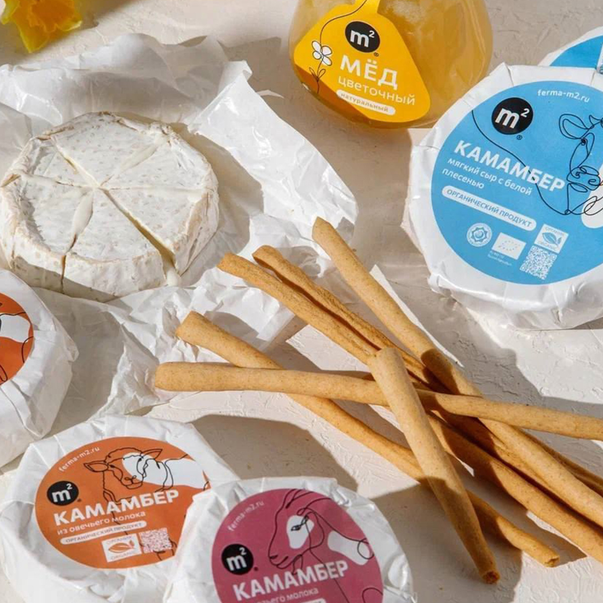 Для производства на Ферме М2 используют органическое цельное молоко. На первом этапе производства его пастеризуют для обеспечения безопасности продукта: коровье молоко – при температуре 72°С, козье и овечье – 68°С. Затем молоко выдерживается при 8-10°C в течение 12-15 часов для естественного созревания. После его нагревают до 30-31°C и добавляют к нему закваски, включающие мезофильные и термофильные бактерии, а также культуру белой плесени. Эти «друзья» остаются в молоке на 60 минут, и в это время важно следить за процессом кислотности молока. Основная задача на этом этапе — активировать культуры, ведь именно от их работоспособности зависит вкус будущего сыра. Лаборант следит за процессом и корректирует параметры при необходимости. Для точного контроля используют специальное оборудование – pH-метр.