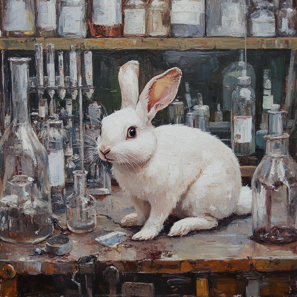 Создано на основе запроса: Out of sight of humans, countless animals are being used as test subjects, suffering or dying. A white rabbit trembling in fear among all kinds of laboratory tools - Oil painting --- Автоперевод: Из поля зрения людей бесчисленные животные используются в качестве испытуемых, страдания или умирания. Как тебе это изображение? 🤔 https://dzen.ru/id/65c0c65c86e4f837c27b24d7 #ИИ #AI #нейросеть #midjourney #art