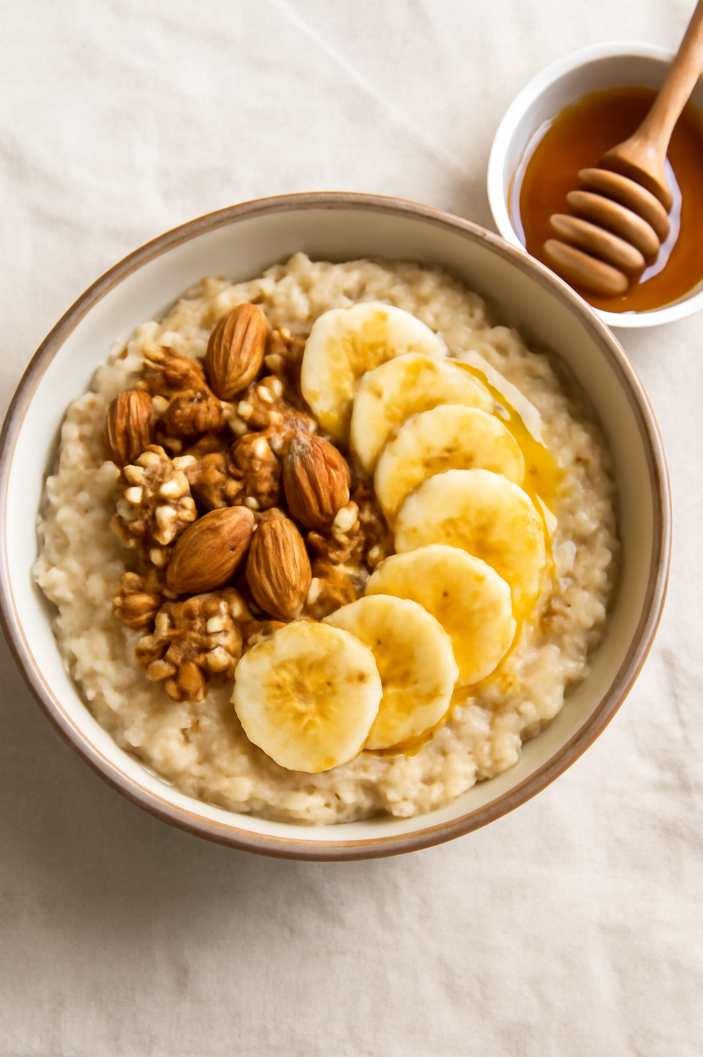 Сладкий ПП завтрак: овсянка с бананами, медом и орехами