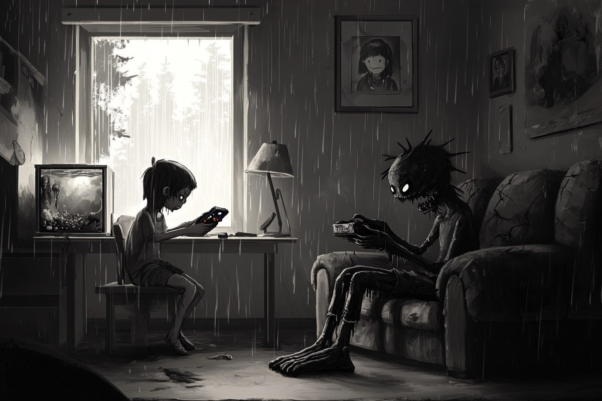 Создано на основе запроса: Kid under desk- A room with a boy sitting on a couch playing a handheld video game. He’s deformed, with long grotesque arms. There’s a creep girl hiding under the desk to the left of the couch that you can barely see her face because she’s in the dark.There’s a window on the left and it is raining outside also. There’s a family picture on the wall above the couch. A side table to the right of the couch with a fish tank on top. Jake is kneeling on the floor to the girls height and reaching for the girl with his right hand --- Автоперевод: Малыш под столом- комната с мальчиком, сидящим на диване, играющей в портативную видеоигру. Красиво вышло? 🤔 https://dzen.ru/id/65c0c65c86e4f837c27b24d7 #ИИ #AI #нейросеть #midjourney #art