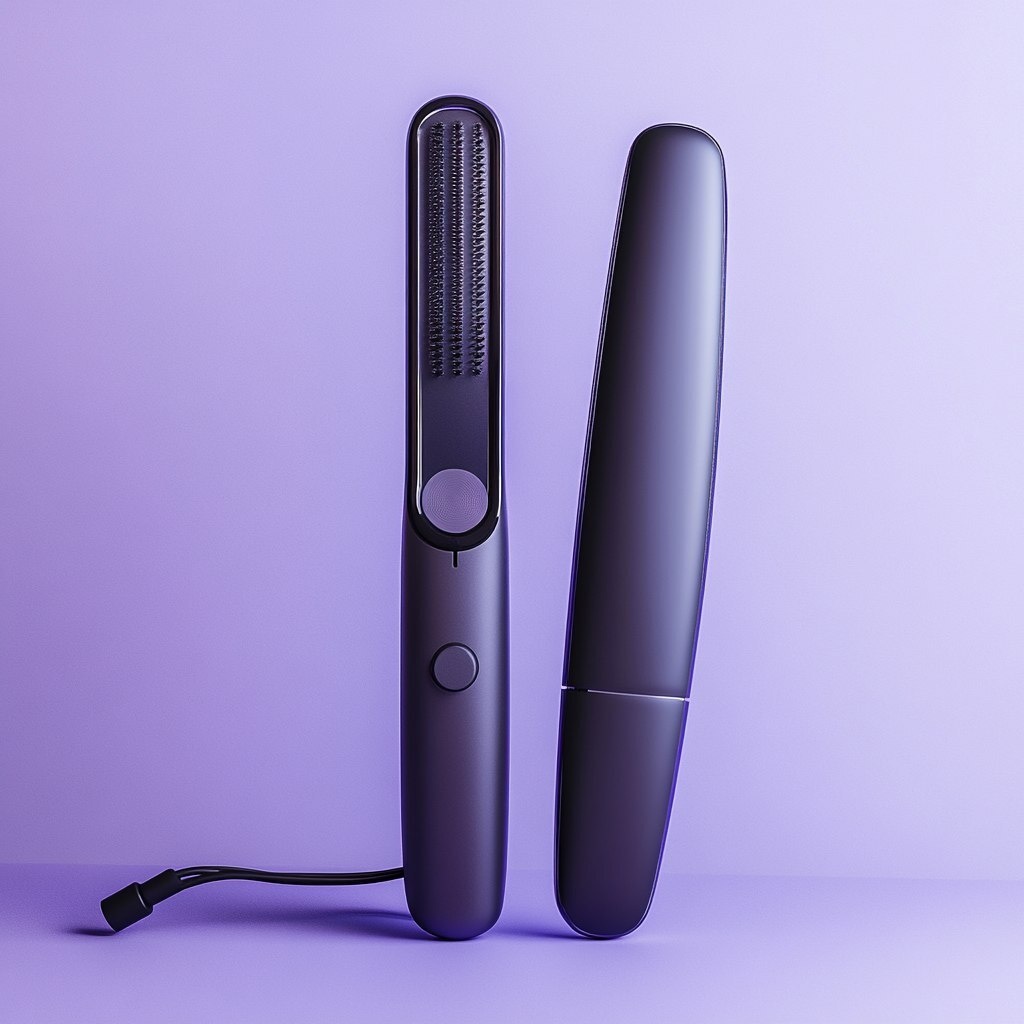 Создано на основе запроса: A modern, high-end hair styling equipment setup placed against a plain violet background. The scene features a sleek hair straightener or curling wand with a matte or glossy black and metallic finish, complete with a visible power cord for realism. The design is minimal with clean lines, no visible branding, and a focus on form and detail. Soft, diffused lighting creates gentle highlights and shadows, adding depth and a realistic touch to the overall presentation. The mood is sophisticated, functional, and stylish --- Автоперевод: Современная настройка оборудования для укладки волос высокого класса, расположенная на простых фиолетовых фонах. Как тебе такое изображение? 🤔 https://dzen.ru/id/65c0c65c86e4f837c27b24d7 #ИИ #AI #нейросеть #midjourney #art