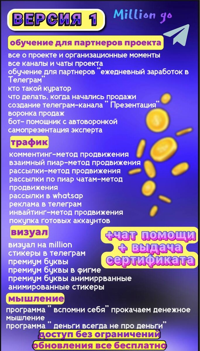 😀Тариф "Миллион на Телеграмм" ВКЛЮЧАЕТ В СЕБЯ 2 ВЕРСИИ : Версия 1 : твой старт во фрилансе Версия 2 :ты эксперт С ЭТИМ ТАРИФОМ ТЫ СМОЖЕШЬ: 🎓 Обучиться удаленным профессиям для работы в ТГ: ✅Эксперт по визуалу ✅создание букв и стикеров ✅создание чат-ботов ✅Менеджер по продвижению канала 📱 Стать экспертом по ТГ/запустить свое обучение 💻 Стать партнером и предоставлять доступ к тарифу ТАРИФ «МИЛЛИОН НА ТЕЛЕГРАМ» ПОДОЙДЕТ ДЛЯ: ⭐️новичков - если ты только начинаешь осваивать эту площадку, то здесь ты получишь всю полную и последовательную информацию по работе с Телеграмм. Создание канала/наполнение/визуал/методы продвижения. ⭐️опытных пользователей - вы сможете стать экспертом в этой нише, создать свою систему обучения и увеличить свой чек за счет наставничества. ТЕБЕ БУДЕТ ДОСТУПНО: ✅пошаговое обучение в видео и аудио формате ✅материалы для дальнейшей работы: ✅макеты, примеры постов, скрипты ✅чат -поддержки ✅поддержка куратора + уроки по прокачке денежного мышления За подр