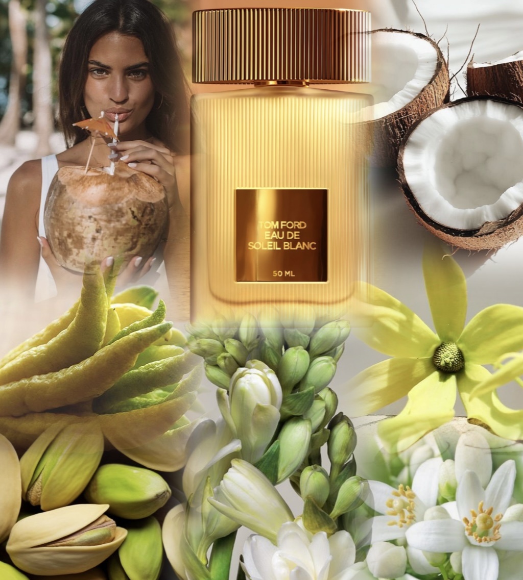 Хотя опять же не совсем подходит ознаменованием "новая версия", ведь это абсолютно такой же аромат Eau de Soleil Blanc, только переизданный в другом флаконе. Это не горящая новинка, аромат уже вышел и продаётся в сетях, так как его презентовали несколько месяцев назад. Tom Ford достаточно быстро распространяет ароматы в сетевые магазины, почти сразу после релиза. Перевыпущен Soleil Blanc не просто в новом флаконе, а во флаконе коллекции Signature, которая славится более приятной ценой, в отличии от бутиковых парфюмов бренда в квадратных флаконах. Это конечно радует, ещё больше людей смогут пользоваться таким приятным солнечным ароматом. Цитрусово-цветочный солнечный аромат вдохновлён далёкими тропическими островами, где один день плавно перетекает в другой и передаёт атмосферу вечного лета круглый год. Аромат открывается мощным, бодрящим и освежающим аккордом цитрусовых (список внушителен: бергамот, цитрон, горький апельсин и петитгрейн), дополненным пикантным фисташковым аккордом и