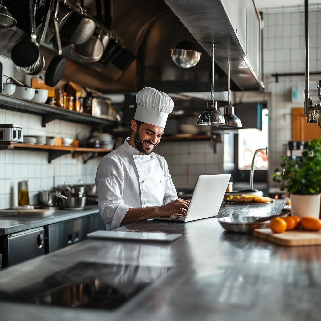 Создано на основе запроса: A bright, professional kitchen setting. A chef stands or sits in front of a laptop with a blank white screen, typing on the keyboard. He is smiling, suggesting ease or satisfaction. The chef is not in close-up --- Автоперевод: Яркая, профессиональная кухонная обстановка. Как тебе эта картинка? 🤔 https://dzen.ru/id/65c0c65c86e4f837c27b24d7 #ИИ #AI #нейросеть #midjourney #art