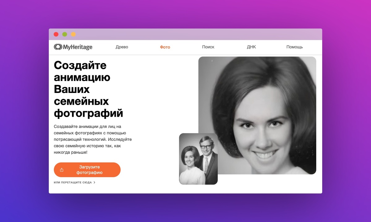 Современные технологии позволяют превратить статичное изображение в анимированную фотографию всего за несколько кликов. Пользователи соцсетей активно используют такие сервисы, чтобы анимировать картинку, создать эффект «живого» фото и просто удивить друзей. В этой статье рассказываю о лучших нейросетях и приложениях, которые помогут оживить фото онлайн бесплатно или за небольшую плату. Принцип работы: Deep Nostalgia от MyHeritage использует искусственный интеллект для анимации лиц на старых фотографиях. Алгоритм оживляет черты лица — глаза, улыбку, мимику. Анимированная фотография выглядит как короткое видео (в формате gif или mp4), где персонаж из прошлого словно оживает на ваших глазах. Условия использования: Необходима регистрация. Можно использовать бесплатно до определённого лимита. Далее требуется подписка. Стоимость: Бесплатная версия — до 3 анимаций. Подписка — от $12 в месяц. Ссылка: myheritage.com/deep-nostalgia Пример результата: Принцип работы: Сервис оживляет фотографии,