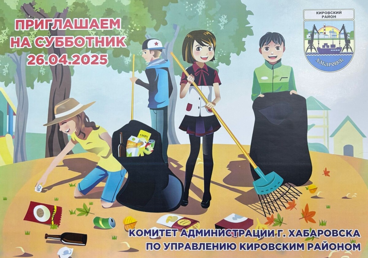 Дорогие друзья! Приглашаем вас присоединиться к городскому субботнику, который пройдет с 26 апреля на территории нашего Кировского района и всего города Хабаровска. Традиционный городской субботник — масштабная экологическая акция, объединяющая тысячи людей в стремлении сделать свой город чище и уютнее. Субботник — это не просто уборка. Это добрый пример и вклад в общее дело, это забота о родной земле. Приглашаем всех неравнодушных жителей Кировского района выйти на уборку дворов, улиц, общественных пространств, чтобы сделать наш район чистым, благоустроенным и красивым! Примите участие! Не оставайтесь в стороне! Позаботьтесь о том, что заботится о нас! Сделаем окружающий нас мир чище! рубрика #вопросы_благоустройства #чистыйкрай27 #генЕРальнаяуборка #делаемгородлучше