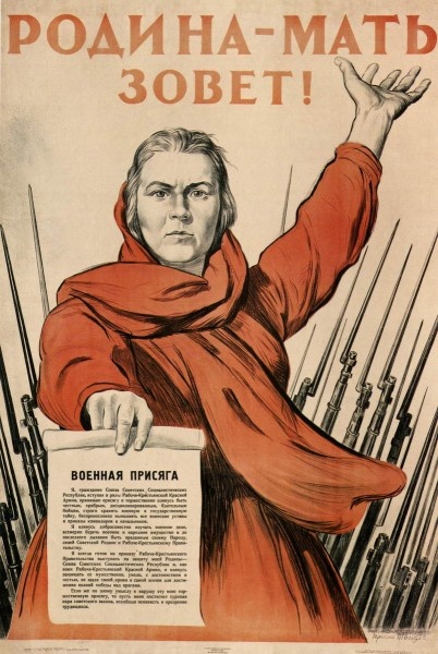 - «Родина-мать зовёт!» (Ираклий Тоидзе, 1941) — женщина в красном, символизирующая СССР, призывает к сопротивлению.