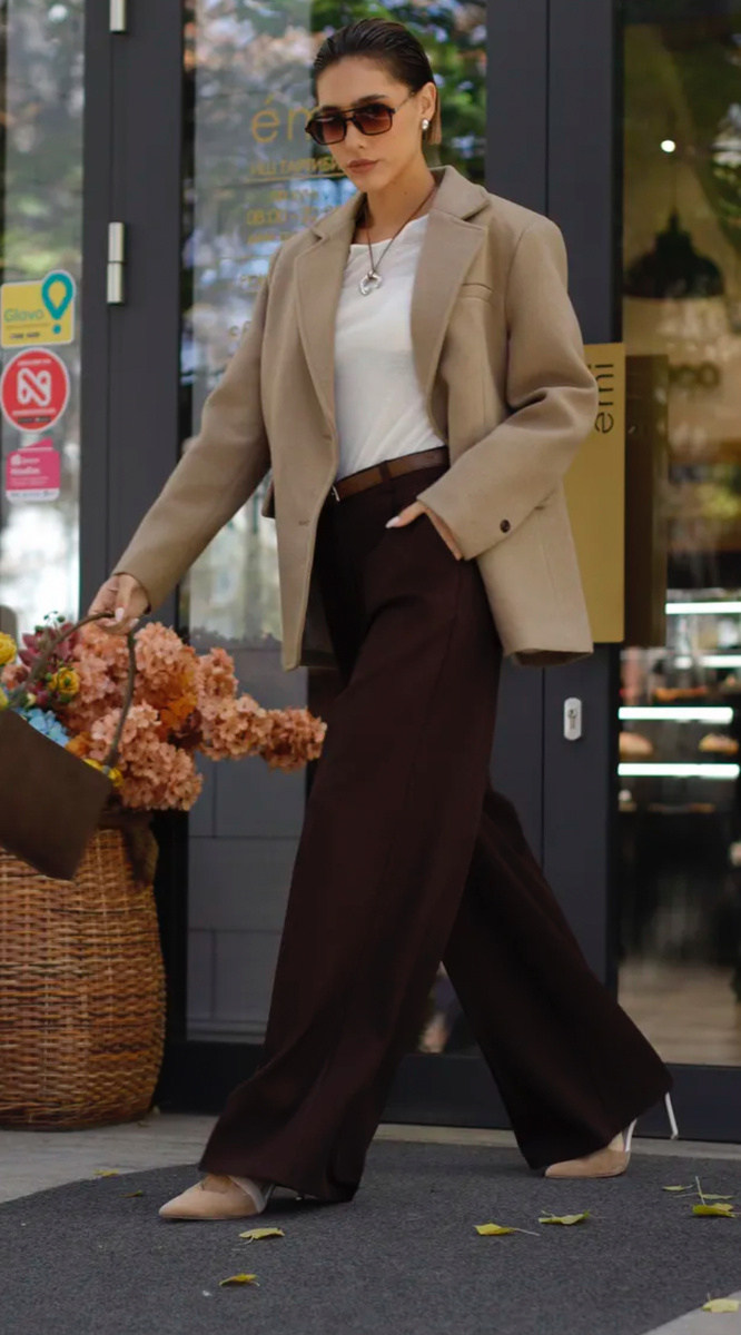 Играйте с формами: оверсайз-пиджак с зауженными брюками, свободная блуза с юбкой-карандаш. Цветовая база: белый, чёрный, серый, кремовый, хаки — база для капсулы.