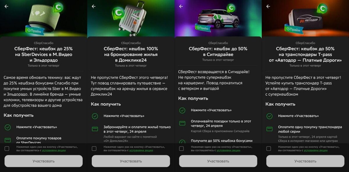 ✨ СберФест: до 20 000 бонусов Спасибо 📅 24 апреля в приложении Сбера стартует СберФест — раздача бонусов Спасибо за оплату картами у партнёров. В отдельных случаях можно вернуть всю сумму покупки. 🟢 Важно: Для участия нужно нажать «Участвовать» в разделе «Для жизни» в приложении. Без этого бонусы не начислятся. После нажатия — подождать 15 минут, и только потом платить. 🎁 Партнёрские акции: 🛍 🛍 Эльдорадо и М.Видео — до 7 000 бонусов — 20% (25% с СберПрайм) за покупку только Sber Devices — Начисление один раз, лучше брать на крупную сумму 🚗 СитиДрайв — до 500 бонусов — 45% (50% с подпиской) за поездки 🛣 Автодор — до 2 500 бонусов — 42% (47% с Праймом) за покупку транспондера T-pass 🏠 ДомКлик — до 20 000 бонусов — 100% бонусами за первую оплату аренды — Фактически возвращают всё — шикарный вариант 🔥 Бонус: С СберПрайм — +5% и увеличенные лимиты.