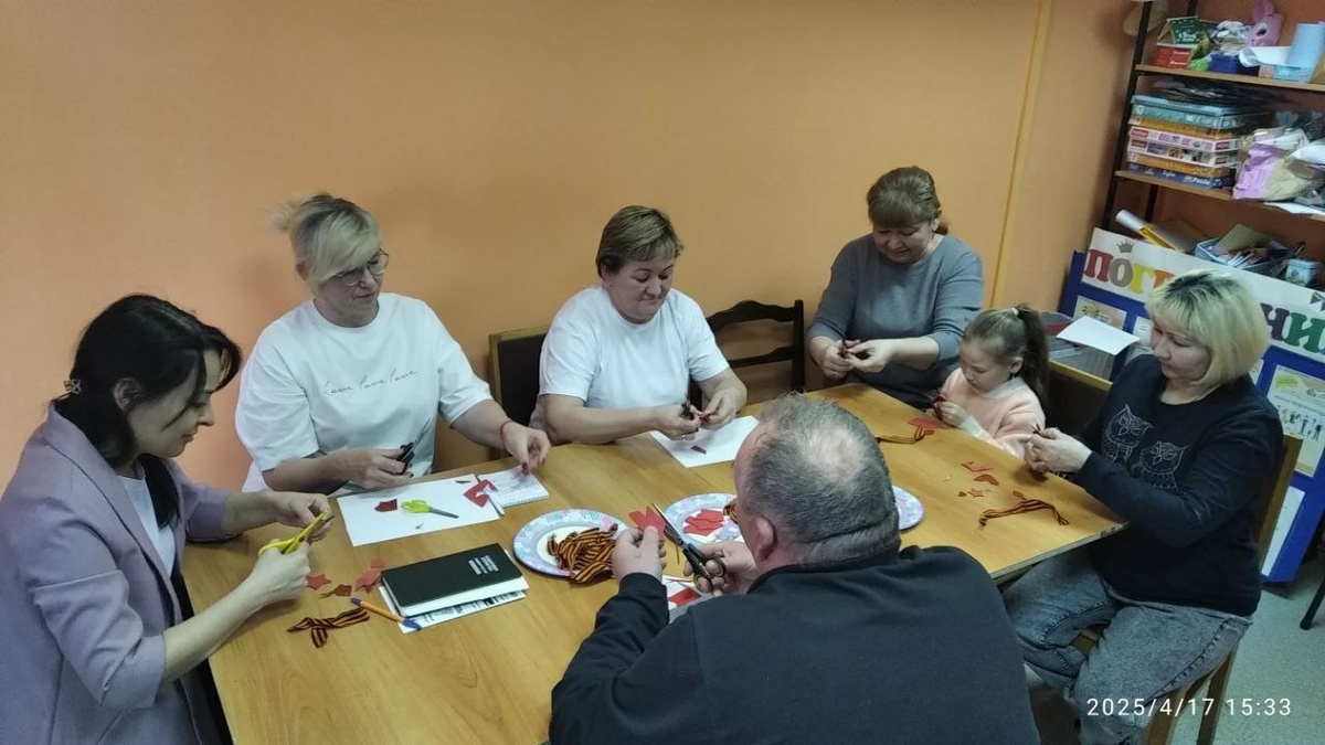 В творческой части в честь празднования Года защитника Отечества все дружно поработали над созданием нагрудного символа Победы – георгиевской ленточки со звездочками в технике 3D.