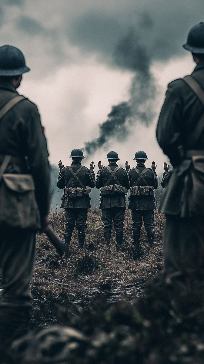 Автоперевод: Немецкие солдаты, поднимающие руки в сдаче, одинокий американский солдат, наблюдающий за ними, реалистичная униформа Первой мировой войны, пасмурное освещение, эмоциональное воздействие