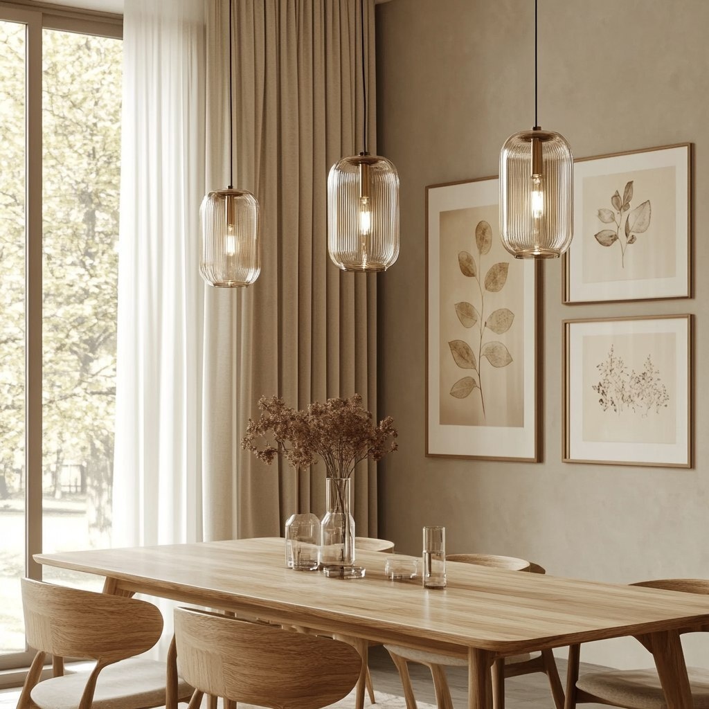 Создано на основе запроса: Scandinavian-style dining room interior, minimalist wooden dining table with natural grain, pendant lights with