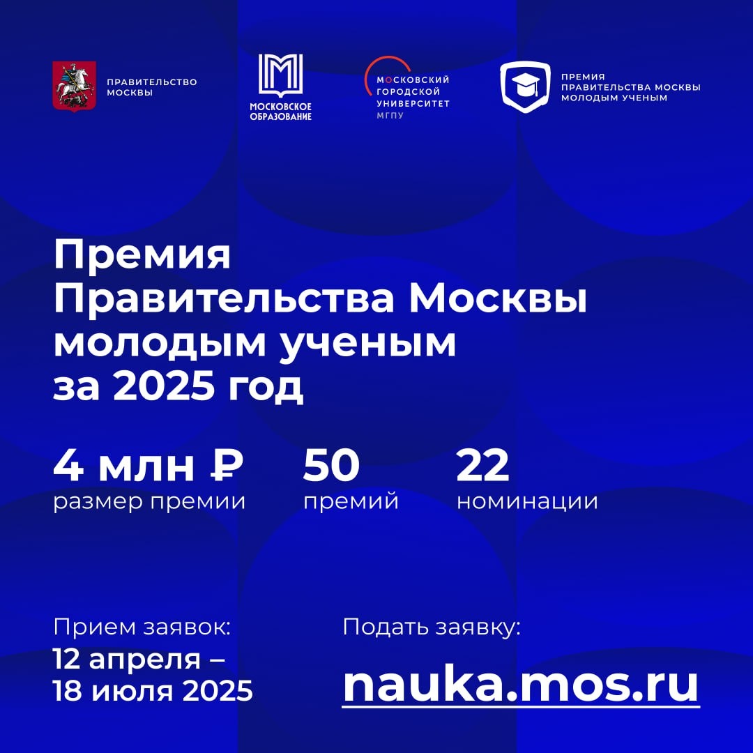 Открылся прием заявок на соискание премии Правительства Москвы молодым ученым за 2025 год. С этого года размер премий молодым ученым увеличен с 2 млн до 4 млн рублей. Участие в конкурсе могут принять исследователи и разработчики в возрасте до 35 лет включительно, доктора наук — до 40 лет включительно. Представлять проекты можно как индивидуально, так и в составе научного коллектива (не более трех человек). Всего присудят 50 премий по четыре миллиона рублей. Заявки принимаются до 18 июля 2025 года на странице премии https://nauka.mos.ru/ . Итоги конкурса подведут в январе 2026 года.