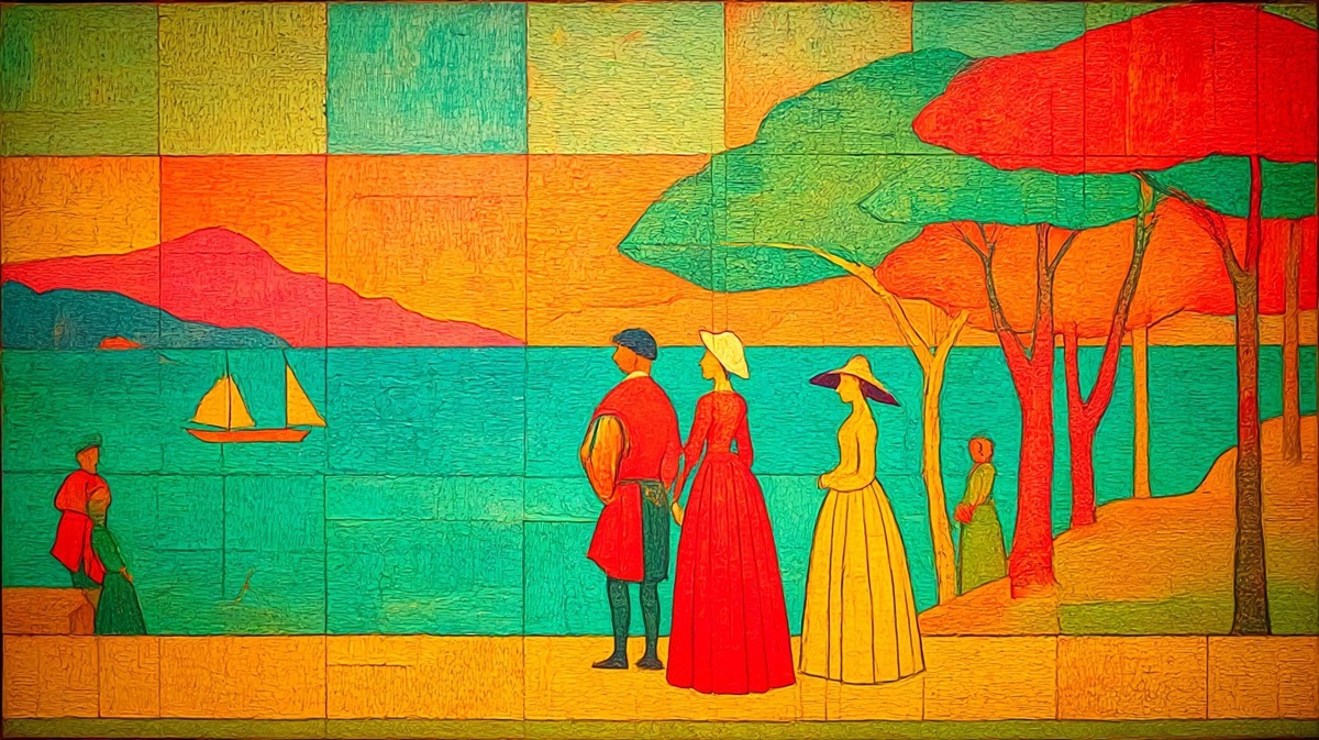 Создано на основе запроса: Paul Gauguin style version of Giorgione's 'The Tempest' : The scene reimagined with flat areas of bold, non-naturalistic color, simplified forms, and heavy outlines. The figures adopt a primitive, symbolic quality against an exotic, synthetist landscape
