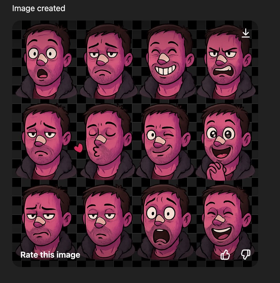 В современном мире мессенджеры и социальные сети играют огромную роль в нашей повседневной жизни. Мы общаемся с друзьями, семьей и коллегами, и часто используем стикеры для выражения своих эмоций и чувств. Теперь, благодаря технологии искусственного интеллекта и возможностям ChatGPT, вы можете создать свой собственный уникальный стикерпак с вашим лицом, не прибегая к использованию сложных программ, таких как Photoshop. Вот подробный гайд, как это сделать всего за три простых шага. Первое, что вам нужно сделать, это загрузить свое фото. Это может быть любое качественное изображение, на котором четко видно ваше лицо. После загрузки фото, вам нужно дать ChatGPT следующий промт: "На основе моего фото и внешности создай набор из 12 стикеров в мультяшном стиле. На каждом стикере должна быть разная эмоция: удивление, разочарование, радость, гнев, печаль, поцелуй, подмигивание (кокетливость), восхищение, отвращение, скука, ужас, веселье. Сделай стикеры на прозрачном фоне, с чётким контуро