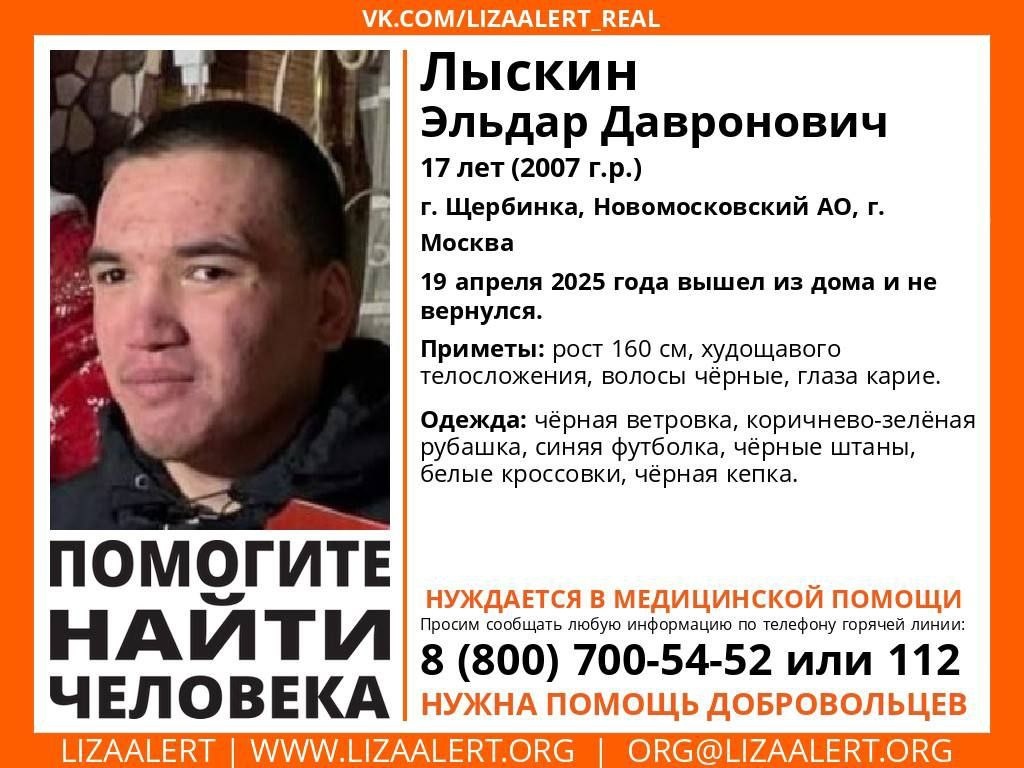 ❗️Пропал подросток! Лыскин Эльдар, 17 лет, Щербинка, НАО, Москва. 19 апреля вышел из дома и не вернулся. Может находиться в вашем городе! Инфорги: 📞 Луми (Дарья), 89807247497; 📞 Варби (Варвара) 89251534771. Гор. линия ПСО "ЛизаАлерт": 8(800)700-54-52.