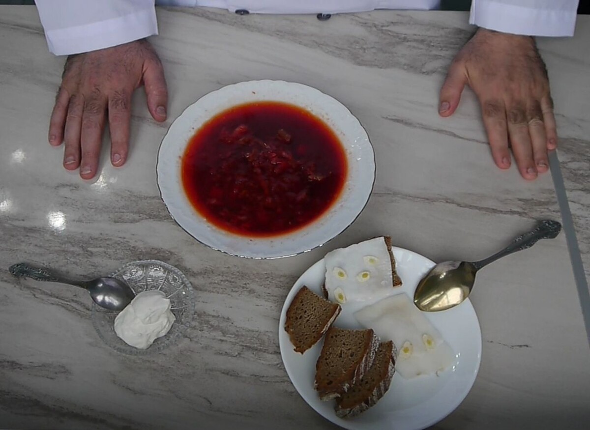 Рецепт 2 шт. луковицы средние (300-320 гр) 2 шт. морковь средние (200-220 гр) 220-250 гр белокочанная капуста 4 шт. свекла средние (450-500 гр) 3 шт. картофель средние (250-270 гр) 2 л. вода 400 гр говяжья голяшка 25-30 гр соли 200 гр тёртые свежие помидоры (у меня консервированные томаты с перцем) 1 ч.л. перец горошком 2 лаврового листа 30 гр чеснока (одна головка) В кастрюлю наливаем 2л воды комнатной температуры, туда же кладём всю морковь, одну луковицу (ее можно порезать пополам), говяжья голяшка и соль. Ставим на огонь, включаем максимальный нагрев и доводим до кипения. Далее температуру понижаем на минимум, снимаем пенку и оставляем варится на 3,5-4 часа на минимальном огне. Параллельно делаем пассировку. В сковородку наливаем небольшое количество растительного масла, разогреваем и добавляем мелко нарезанный лук и доводим его до золотистого цвета, нагрев при этом на среднем значении. Далее к луку добавляем натёртую свеклу. На сильном огне все перемешиваем, 2-3 минуты обжари