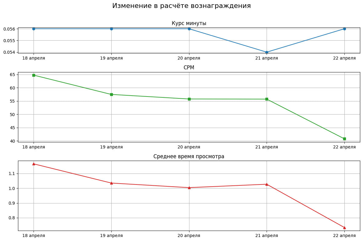 Дзен сократил выплаты за 22 апреля — это сбой? Авторы заметили, что за 22 апреля Дзен выплатил меньшую сумму вознаграждения в пересчёте на просмотры. Или, если угодно, засчитал меньше минут при том же количестве просмотров. Курс минуты (то есть сумма вознаграждения за минуту вовлечённого просмотра) остался прежним. В официальном чате Дзена в Telegram уже прокомментировали проблему и пообещали пересчитать вознаграждение: «За 22 апреля расчёт вознаграждения у некоторых блогеров мог произойти некорректно. Мы исследуем ситуацию. Авторам, которых это коснулось, придёт компенсация». На моём канале CPM снизился с ~56 руб. за 1000 просмотров до 41 руб., то есть на 27%. Очень надеюсь, что всё пересчитают. И хотелось бы, чтобы в будущем таких ошибок не происходило.