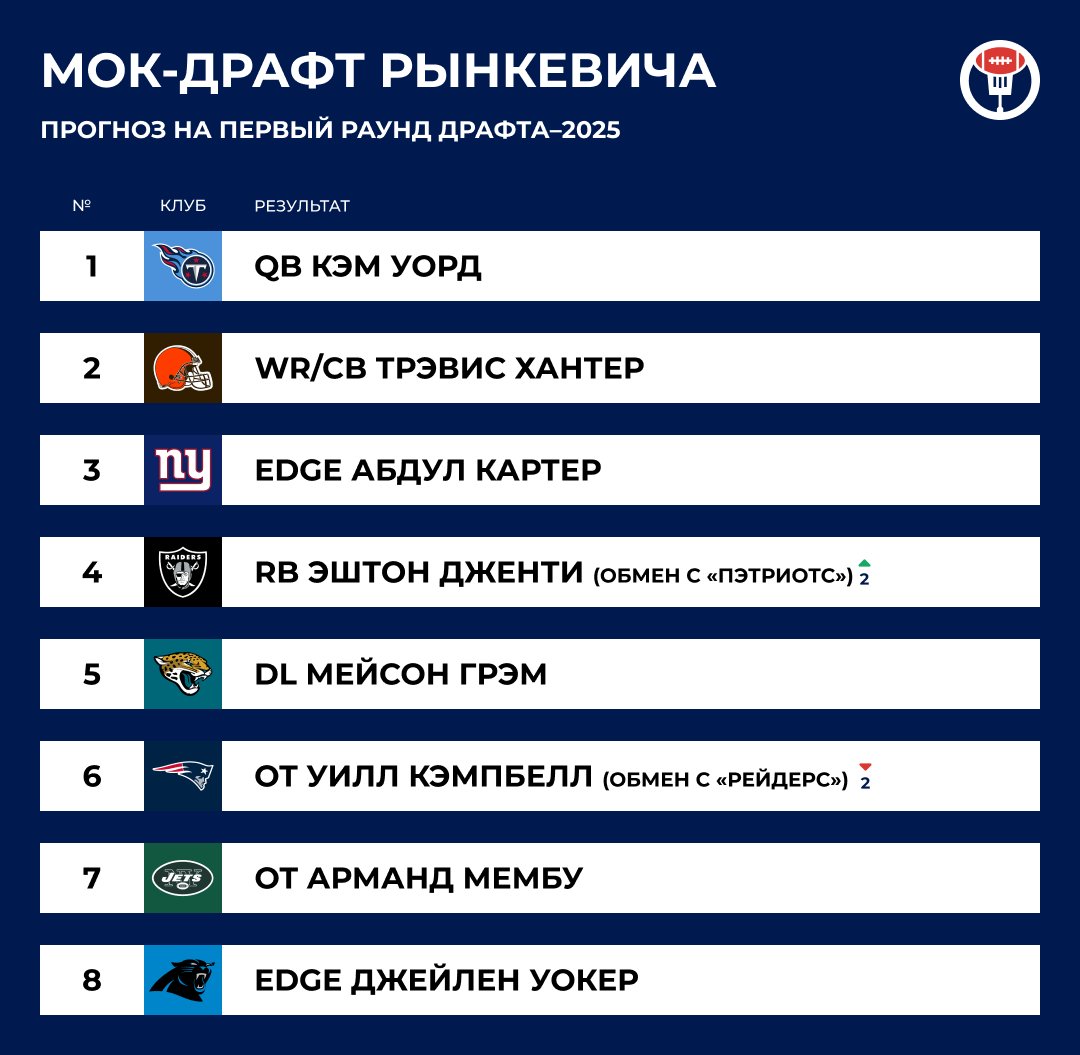 Я думаю, что «Рейдерс» на старте нового проекта хотят получить звездного игрока нападения настолько сильно, что готовы прыгнуть вверх. Миноритарный владелец «Лас-Вегаса» Том Брэди легко найдет общий язык с руководством своей бывшей команды, тем более, что «Пэтриотс» опуститься на две позиции вниз некритично. Они могли бы отказаться от обмена, останься доступным кто-то из пары Хантер/Картер, а так под шестым номером они в любом случае получат своего топового линейного нападения.