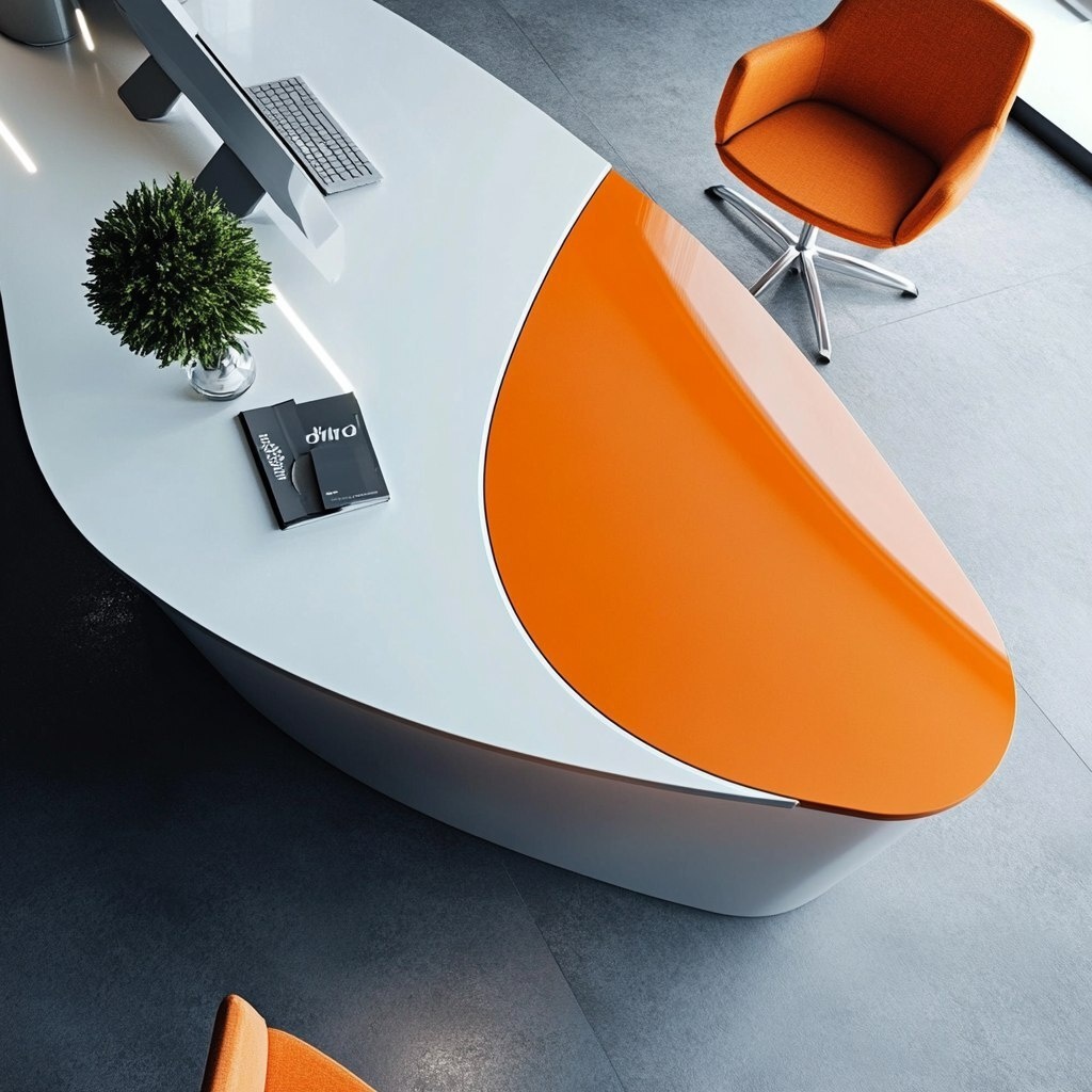 Создано на основе запроса: Reception desk, table close-up, slightly overhead view, modern, colors orange, white, gray