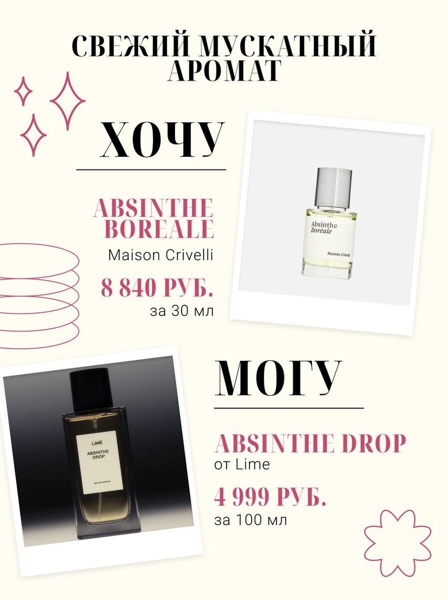 В воздухе появились предвестники майской грозы и солнце уверено повернуло на лето. Самое время для прохладных свежих ароматов с привкусом полыни — каплей абсента. В рубрике хочу/могу пара прекрасных флаконов для l’heure verte ✨🌸 ➡️Maison Crivelli Absinthe Boreale — аромат 2019 года, нос Nathalie Feisthauer. Прохладный и свежий как ледяной лимонад с лавандой и мятой в жару. Идеальный, чтобы пребывать в медитативном состоянии с утра и весь день… ➡️LIME Absinthe Drop — аромат 2025 года, уютный и свежий, но теплый как лучи солнца, пробивающие макушки сосен летним утром. Таким не переборщишь и он не надоест. Если хотите узнать историю абсента, за что его любили Бодлер, Мане, Рембо, Уайльд, Ван Гог, Пикассо и почему напиток запрещали, вам сюда ⤵️ https://t.me/winemoviesandfood/348 В ароматах абсент точно безопасен, проверено. А какие ароматы с полынью известны вам?
