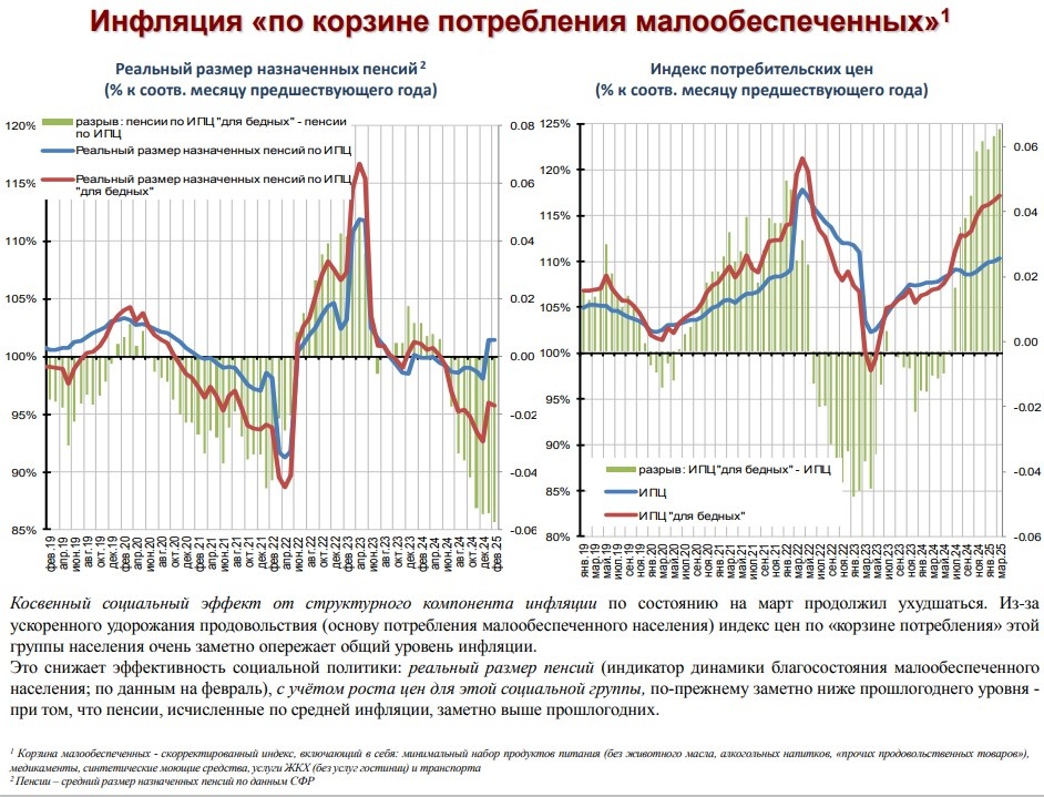 Выражение "инфляция - это налог на бедных" становится все актуальнее с каждым месяцем. Потому как общий уровень инфляции в последние месяцы примерно стоит на месте, а в недельном выражении порой даже снижается, а вот инфляция для бедных, тем временем, продолжает стремительно расти с каждым месяцем. Термин "инфляция для бедных", если что, ввели в обиход правительственные экономисты из ЦМАКП, которые рассчитывают этот показатель на основе официальных данных Росстата (то есть, это даже не альтернативные подсчеты вроде Ромира, которому запретили их публиковать, а совершенно официальные цифры). Вот уже около года ежемесячные аналитические доклады ЦМАКП (поступающие в правительство, ЦБ, администрацию президента, буквально во все ветви и органы власти) содержат отдельный слайд об инфляции для бедных (в апрельском докладе его назвали "инфляцией для малообеспеченных" - наверное уже сильно резало слух, но в сопровождаемом тексте называют все так же: "для бедных"). В расчет этой инфляции входят с