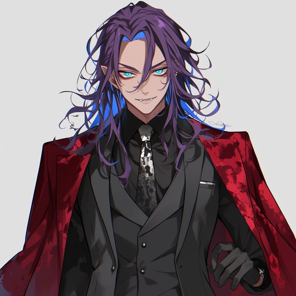 Создано на основе запроса: Full-length vampire guy with purple hair and blue eyes in a luxurious bright suit