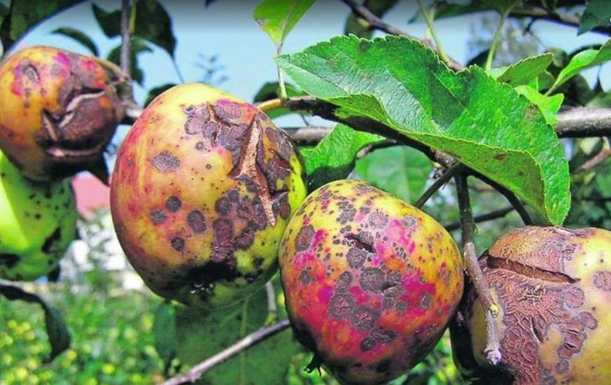 Если весной не защитить дерево, парша перебирается на плоды. Там она тоже делает темные пятна с коркой.