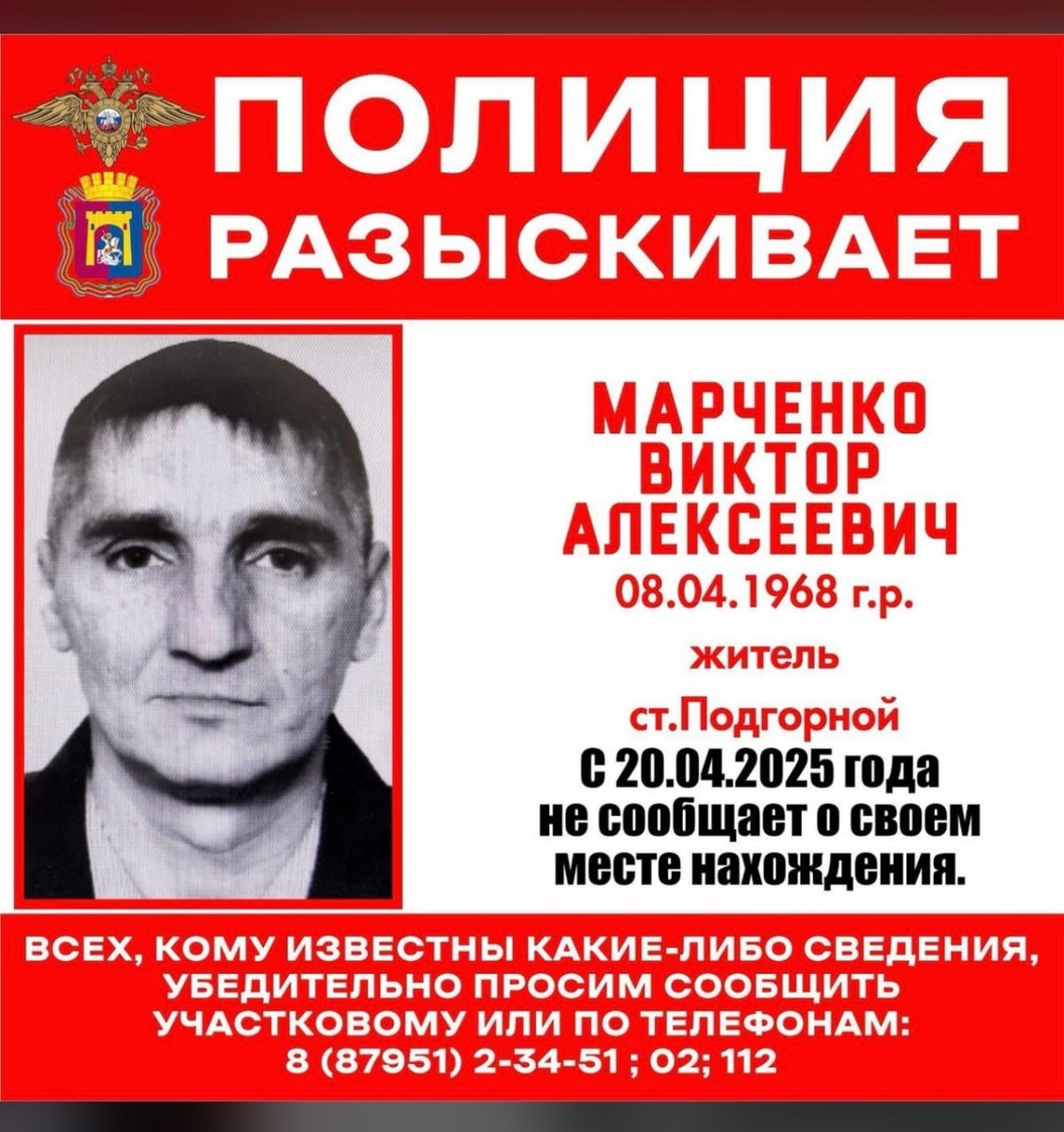 ❗️На Ставрополье ищут без вести пропавшего мужчину В Георгиевском округе полицейские разыскивают 57-летнего жителя станицы Подгорной. С 20 апреля о его местонахождении ничего неизвестно. Марченко Виктору Алексеевичу 57 лет. В момент исчезновения он был одет в трико, тёмную футболку и кепку-восьмиклинку. С собой взял синий велосипед с корзиной. Если вы что-то знаете о местонахождении пропавшего, позвоните по номеру 02, 102 (с мобильного) или (87951)3-51-00, +7 (928) 368-09-03, +7 928 374-24-04.