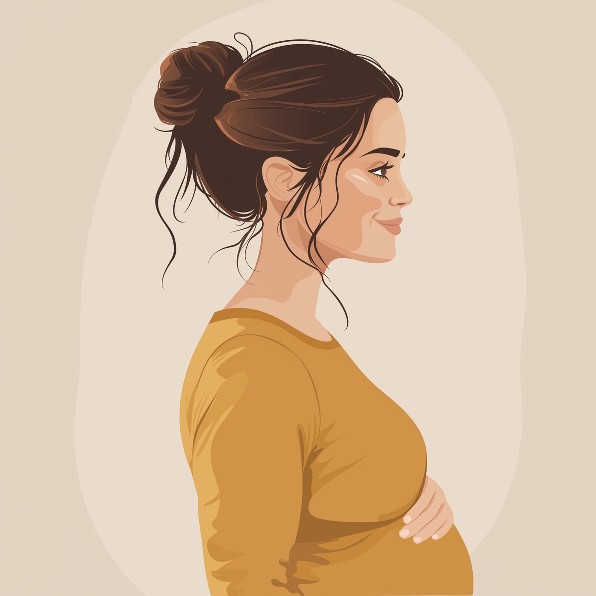 Создано на основе запроса: Generate a detailed vector Illustration of a pregnant woman looking happy with a subtle smile, looking straight. Front view of the woman illustration. A side profile illustration of a woman with a neutral expression, facing straight with a smile. She has medium to fair skin, soft facial features, and natural light makeup. Her hair is dark brown, neatly tied into a low bun with subtle waves and highlights, and a few loose strands. The background is a plain, light beige. The illustration should be in a clean, modern vector art style with soft shadows, warm natural tones, and visible line details, resembling digital hand-drawn techniques. The woman wears a simple mustard yellow top.