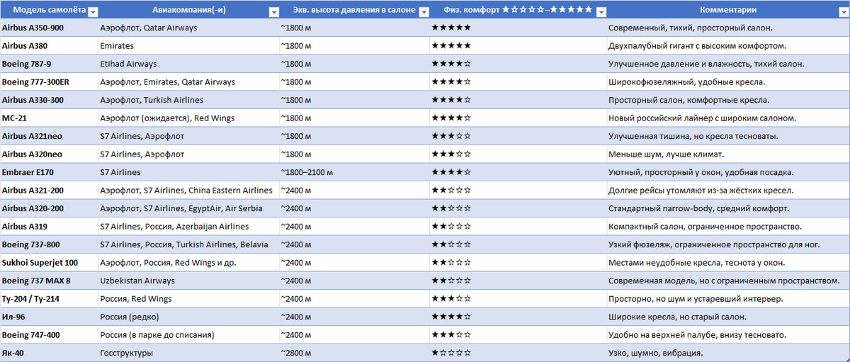 Мы тут немного поизучали вопрос и собрали вот такую табличку, которая может помочь вам выбрать более комфортные условия полёта.