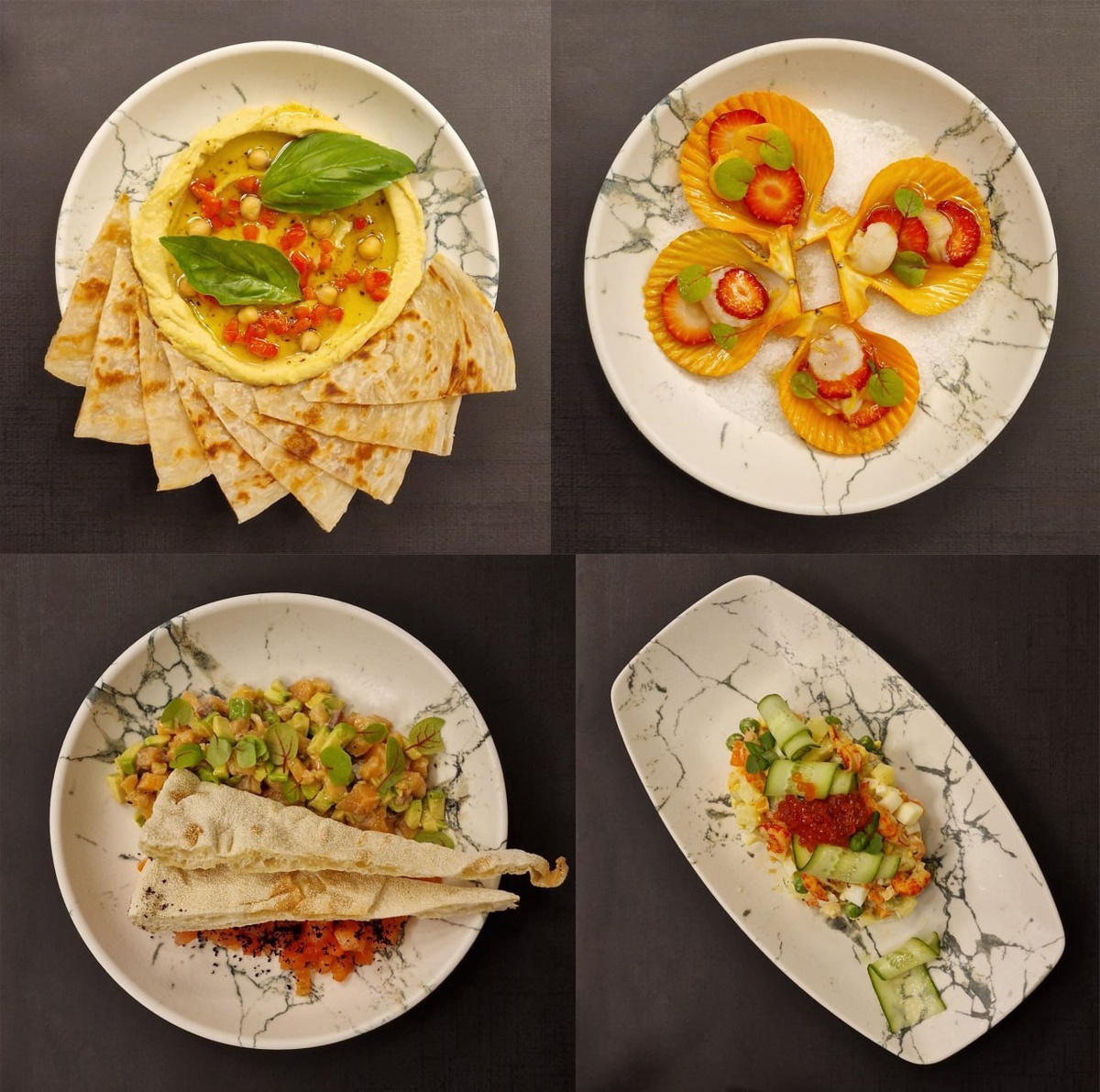 Новое меню включает в себя совершенно разные блюда и кухни мира, точнее их авторские интерпретации – европейская, русская, азиатская, арабская... Разумеется, ориентир на интернациональный состав гостей отеля DoubleTree Arbat Moscow, но это никак не мешает, потому что – вкусно! Решили пробовать совершенно разное, чтобы составить представление о новом меню в целом. Из холодных закусок выбрали: - Хумус с трюфельным медом – немного мусс-консистенции, но очень свежий, нежный и насыщенный вкус. Гуд! - Крудо из золотого гребешка с соусом понзу и клубникой – необычный, в хорошем смысле, микс вкусов. Правда, для нас немного сладковато, но девочкам точно понравится, особенно в сочетании с пузыриками. - Тартар из лосося с томатным конкассе и авокадо – всё ОК, но специй показалось чуть маловато. - Оливье императорский с раковыми шейками и красной икрой – вначале показалось мало заправки, а потом стало ясно, что благодаря этому салат очень легкий, почти диетический, круто! Горячие закуски:
