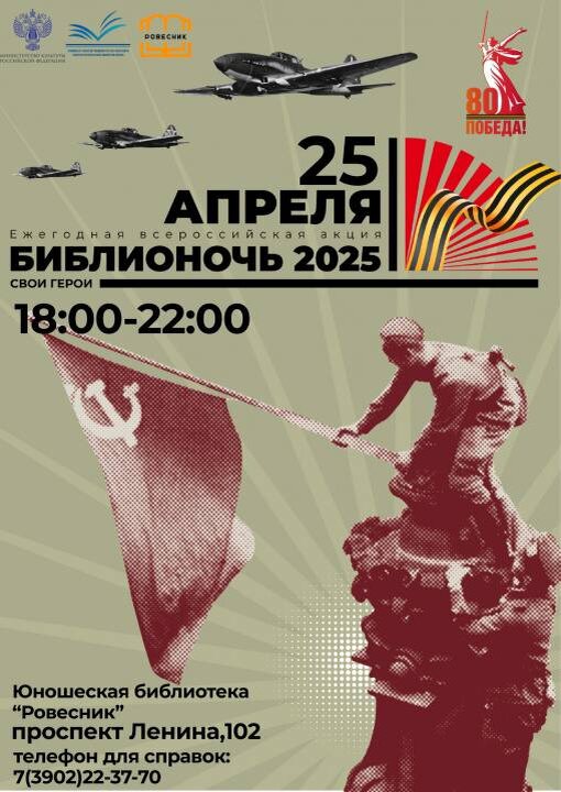 Библионочь-2025: 25 апреля в 18:00 в Абаканской юношеской библиотеке «Ровесник» пройдет ежегодная масштабная акция в поддержку чтения. Тема – «Свои герои». Программа «Библионочи» обещает быть максимально разнообразной. Событие начнётся с торжественного открытия на крыльце библиотеки, после чего участники смогут посетить несколько площадок: «Настольный бой», «Символы Победы». Состоятся мастер-классы в различных техниках: оригами «Боевые машины Победы», декупаж по камню на тему «Оружие Победы», изготовление броши «Георгиевская лента», солдатской пилотки и красной гвоздики. Также все желающие смогут присоединиться к марафону чтения стихов или отрывков из художественных произведений на открытом микрофоне «О войне стихами говорим…». ☝🏻Вход свободный. 0+