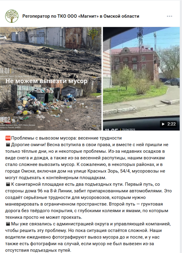 Таяние снега, дожди и весенняя распутица создают препятствия для мусоровозов, которые не всегда могут добраться до контейнерных площадок. Это вызывает неудобства для жителей и может привести к образованию несанкционированных свалок. По информации пресс-службы омского регоператора «Магнит», ежедневно мусоровозы не могут проехать к нескольким десяткам площадок для ТКО. Там, где к решению проблемы подключаются муниципалитеты, управляющие компании, проблемные вопросы удается снять быстро. Например, остро проблема стояла у дома № 54/4 на улице Красных Зорь. Здесь к контейнерной площадке ведут два подъездных пути. Один из них заблокирован припаркованными автомобилями, а второй, грунтовый, полон глубоких колей и ям. В результате мусор не вывозился своевременно. Жители дома обратились к региональному оператору в соцсетях, который, в свою очередь, связался с администрацией округа и управляющей компанией. Благодаря оперативной реакции и разъяснительной работе с автовладельцами удалось освободить