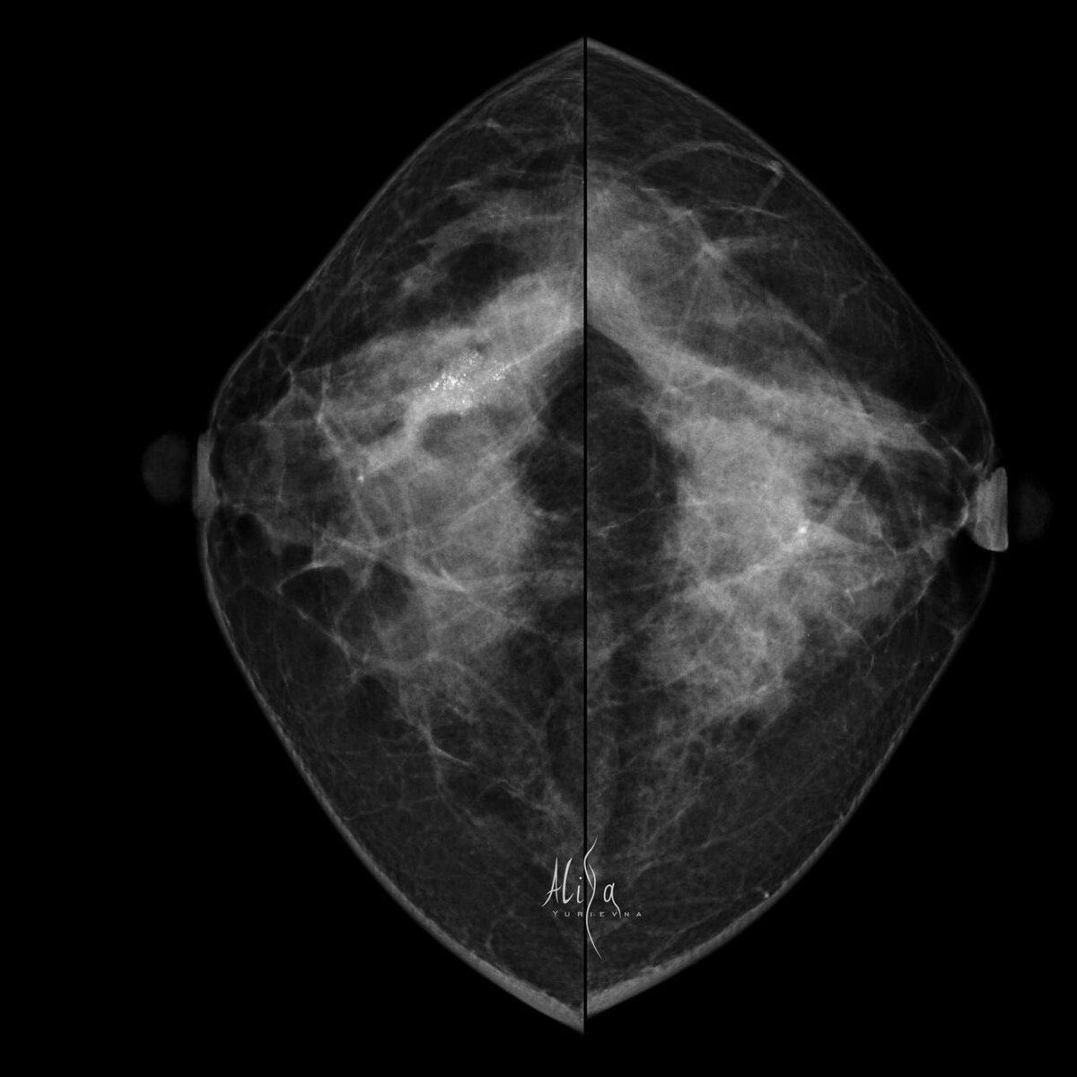 Женщина 41 год Жалоб нет. Первая маммография. История практически ежедневная. Что поможет не пропустить патологию? Правильное, последовательное выполнение методик. Сначала — маммография, потом УЗИ. Такие кальцинаты достаточно хорошо видны при УЗИ, если ваш мозг знает, ЧТО искать и КАК они будут выглядеть. И биопсию, кстати, вы здесь тоже легко выполните под узи контролем. Гистология: cTis (dcic)cN0cM0 Морфологическая картина представлена карциномой in situ high grade.