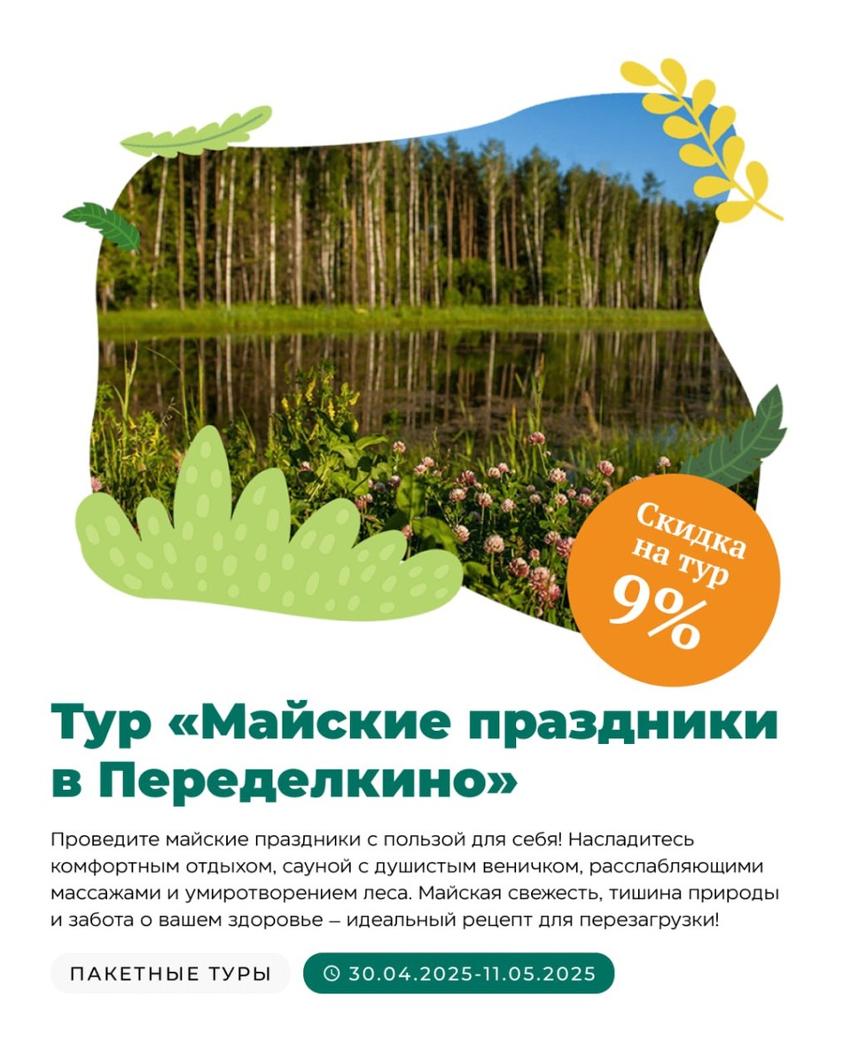 Тур «Майские праздники в Переделкино» ☀️🌳🍢 ⠀ Проведите майские праздники с пользой для себя! Насладитесь комфортным отдыхом, сауной с душистым веничком, расслабляющими массажами и умиротворением леса. Майская свежесть, тишина природы и забота о вашем здоровье — идеальный рецепт для перезагрузки! ⠀ 📅 Даты тура: 30.04.2025 — 11.05.2025 ⠀ 🚖 Бесплатный трансфер от метро Переделкино. ⠀ 🎤 В программе: мастер-классы, концерты, развлекательные программы и викторины, киносеансы, дискотека, караоке, бильярд, настольный теннис, бассейн, 4-разовое питание по системе шведский стол. ⠀ 📋 Подробная праздничная программа ⠀ Оформите бронирование по телефону 📞 +7 (495) 105-90-92 ⠀ До встречи в «Переделкино»! ❤️
