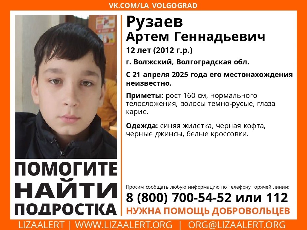 Юного жителя Волжского последний раз видели 21 апреля. Все это время о местонахождении мальчика ничего неизвестно. Артем Рузаев в день исчезновения был в синей жилетке, черной кофте, черных джинсах и белых кроссовках. Приметы 12-летнего школьника: рост 160 сантиметров, нормальное телосложение, темно-русые волосы, карие глаза. Волонтеры поискового отряда «Лиза Алерт» просят всех, кто обладает хоть какой-либо информацией о местонахождении Артема, обращаться по телефонам 880(070-05) 4-52 или 112. Любая деталь может помочь найти пропавшего ребенка. Также для поисковых мероприятий требуется помощь добровольцев.