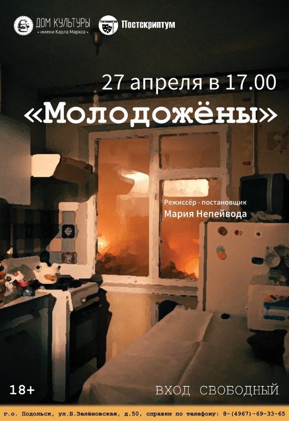 ✨ Спектакль "Молодожёны" 💖Жить вместе долго и счастливо - мечта каждого жениха и невесты. Кажется, что после свадьбы они смогут наладить идеальный совместный быт и никогда не расстанутся. Но бытовые проблемы для молодожёнов часто становятся испытанием. Сможет ли молодая пара не смотря на все обстоятельства побороться за свою любовь? ⏳Продолжительность 2 часа 30 минут с антрактом Режиссёр – постановки Мария Непейвода 🚫 Возраст: 18+ 📆 27.04.2025 🕒 17:00 🏢 ДК им. Карла Маркса 📍 г. Подольск, ул. Большая Зелёновская, 50 💰 Вход свободный❗️ #спектакльПодольск #интересноПодольск ✅ Мероприятия Подольск https://dzen.ru/id/66ed500f7b5671493eca3fd6 http://vk.com/podolsk_events http://dzen.ru/podolsk_events