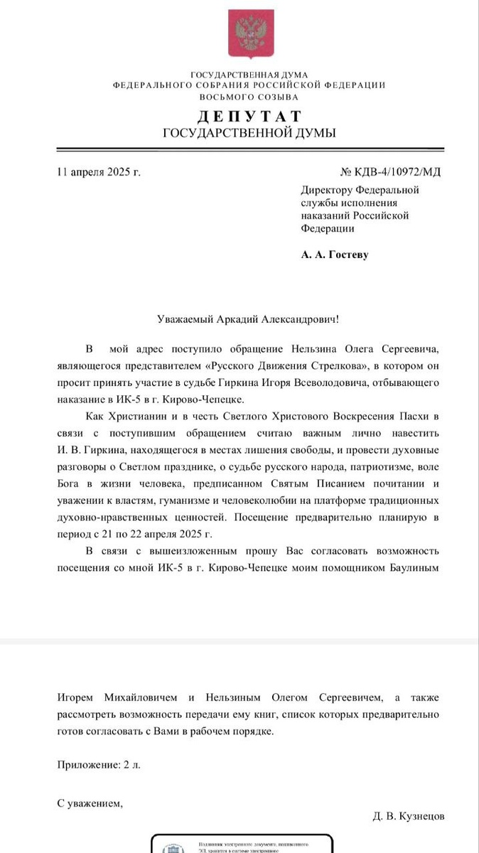 Получил обращение с просьбой принять участие в судьбе Игоря Стрелкова. Приехал в колонию, поздравил с Пасхой, попросил руководство о том, что считал важным по медицинской линии. Спасибо сотрудникам ФСИН за профессионализм и человечность. Мы благодарны команде Игоря Ивановича за участие в судьбе нашего командира после гибели Александра Захарченко. (предупреждение, что на Захара возможно покушение). Разговор начался с человеческих и духовных вопросов, но всё равно свернул на политику. Так же как и Захар, Игорь Иванович более чем скептичен по поводу перспективы переговоров с Трампом и считает важным быть готовыми к испытаниям.