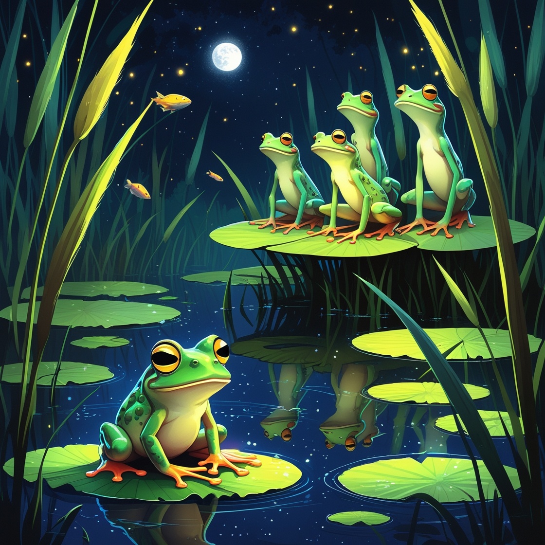 В зелёном болоте, где кувшинки танцевали с ветром, жила лягушка по имени Квара. Все лягушки в болоте славились своим мелодичным кваканьем, похожим на звон колокольчиков. Но Квара была другой: её кваканье звучало громко, хрипло и совсем не похоже на музыку. «Ква-а-арр!» — разносилось по болоту, и лягушки морщились, а цапли посмеивались. «Почему я не могу петь красиво, как другие?» — грустила Квара, прячась в тине. Она пробовала шептать, петь тише, но её голос всё равно гремел, как гром. Лягушки даже попросили её не петь на вечернем хоре, чтобы не пугать рыб.