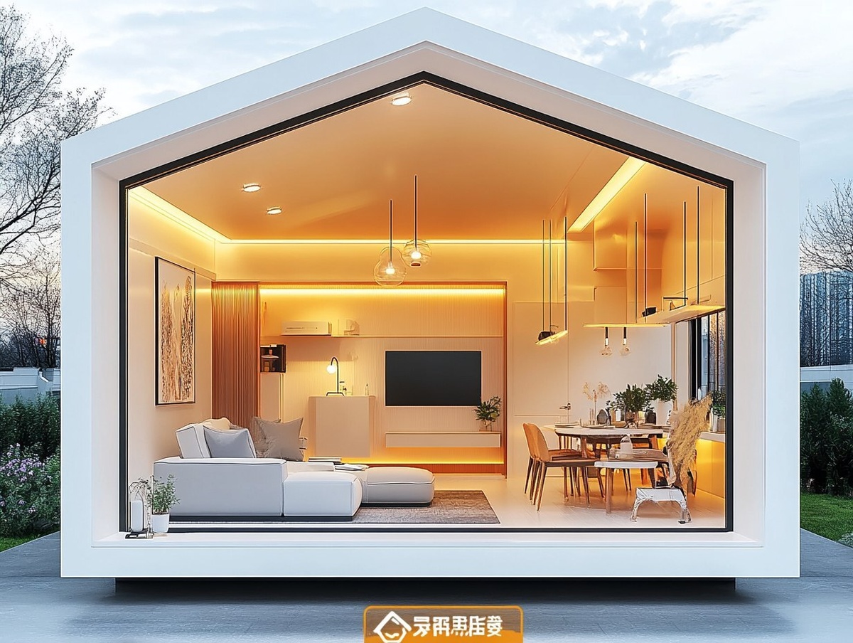 Создано на основе запроса: One-point perspective, a white house frame, inside is a small suite, white and light yellow warm and simple