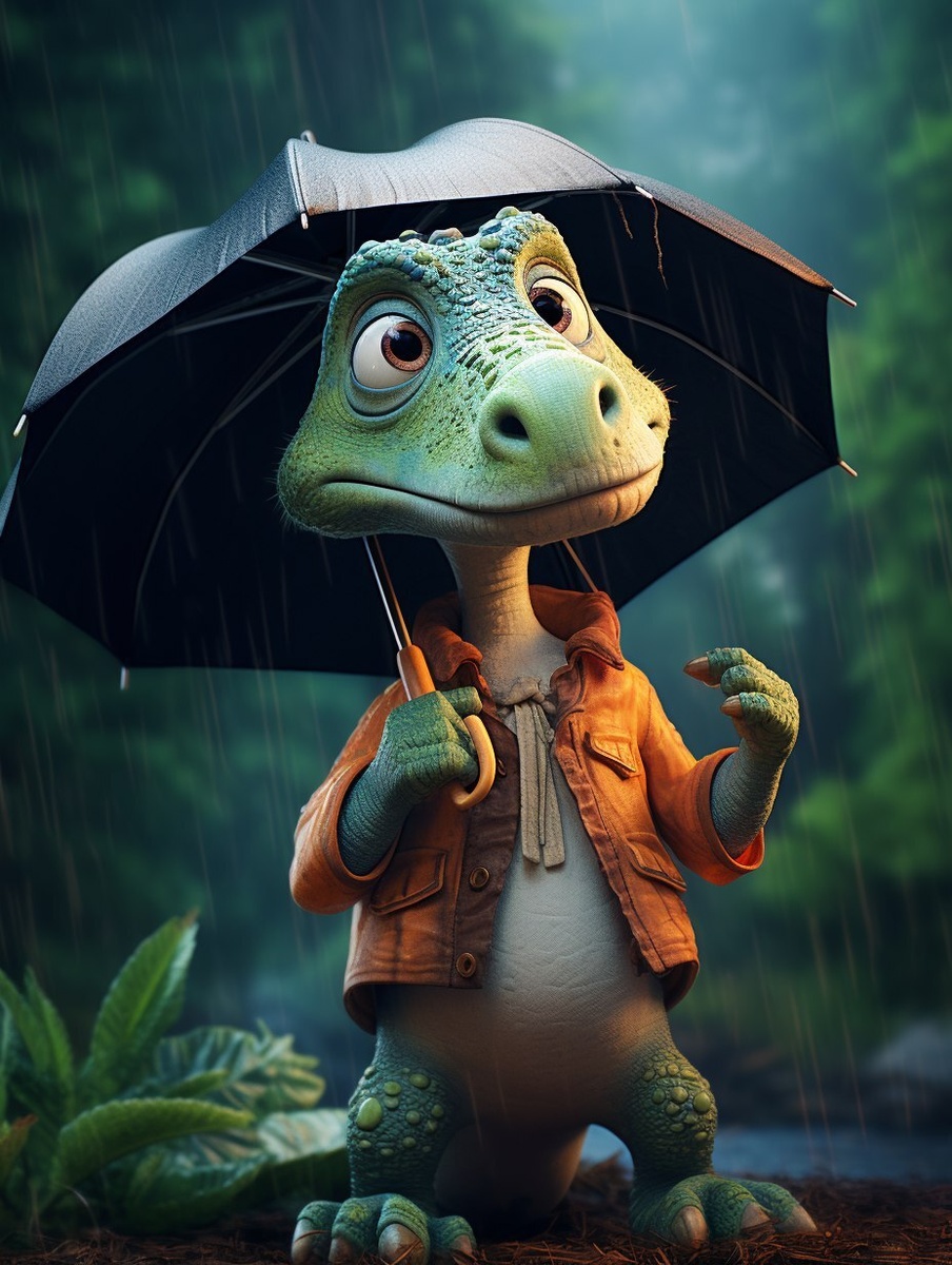 Создано на основе запроса: a grumpy cartoon dinosaur wearing a raincoat and holding an open umbrella, standing in the rain under a cloudy sky, with a forest in the background, Pixar-style, detailed lighting, soft textures, cinematic composition --- Автоперевод: Сварливый мультипликационный динозавр в плащ и с открытым зонтиком, стоящим под дождем под облачным небом, с лесом на заднем плане, в стиле Pixar, детальное освещение, мягкие текстуры, кинематографическая композиция Как тебе это изображение? 🤔 https://dzen.ru/id/65c0c65c86e4f837c27b24d7 #ИИ #AI #нейросеть #midjourney #art