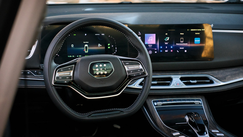 Кресла затянуты в приятную на ощупь искусственную кожу, набиты чем-то умеренно плотным и оснащены подогревом в сочетании с вентиляцией — замечательно, но мне по-прежнему ужасно не хватает регулируемого упора для поясницы. Придётся брать с собой в путешествия кота или маленькую собаку. Руль со скошенным ободом и огромным логотипом в виде латинской буквы E регулируется и по наклону, и по вылету, так что я без труда нашёл удобное положение, несмотря на рост и комплекцию.