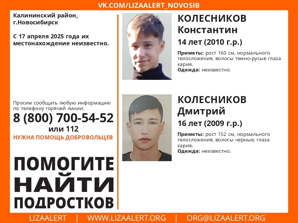 В Новосибирске пропали 16-летний Дмитрий Колесников и 14-летний Константин Колесников. Согласно ориентировке поискового отряда «ЛизаАлерт» региона, школьники исчезли 17 апреля в Калининском районе. Приметы старшего брата Дмитрия: рост 152 сантиметра, нормальное телосложение, черные волосы и карие глаза. Приметы Константина: рост 160 см, нормальное телосложение, темно-русые волосы и также карие глаза. При этом во что были одеты подростки в день исчезновения — неизвестно. Поисковый отряд обращается к добровольцам за помощью подростков. Если вам что-либо известно о местонахождении пропавшего подростка, сообщите, пожалуйста, по телефону горячей линии отряда 8-800-700-54-52 (круглосуточно, бесплатно) или по номеру 112. Ранее стало известно, что в Новосибирске с 12 апреля ищут 16-летнюю Дарью Симакову. Екатерина Павлюх