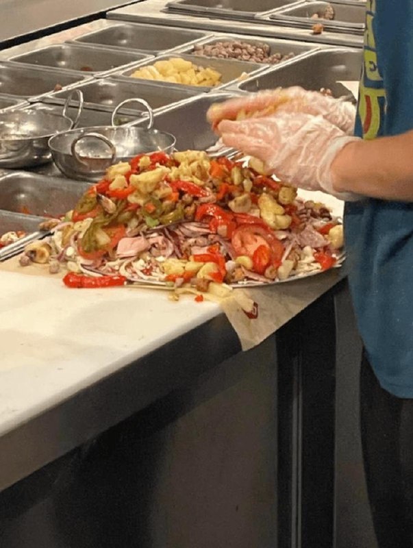Фотография, появившаяся в интернете, вызвала настоящую боль у ценителей пиццы, ведь на ней представлена закуска, которая наверняка получилась невкусной и недостаточно пропечённой. Такие выводы напрашиваются сами собой, стоит только посмотреть на чрезмерное количество начинки (по сути целую гору начинки), красующееся на лепёшке. Остаётся лишь вздохнуть и признать этого «монстра» кулинарным преступлением. К дискуссии шокированных комментаторов присоединились люди, уверенные, что фото было сделано в США или в Канаде в сетевой пиццерии «MOD Pizza». Некоторые пользователи, работающие в этих ресторанах, отметили, что порой к ним являются чудаковатые посетители, требующие положить на пиццу все имеющиеся в ассортименте начинки. Неизвестно, насколько это вкусно, но готовить такую пиццу и впрямь нелегко. Обилие добавок просто не даёт ей испечься как следует. Но желание клиента — закон. (Может кнопка на телефоне залипла или телефон в кармане сам пиццу вызвал - хотя я хз, как у них там с технологи