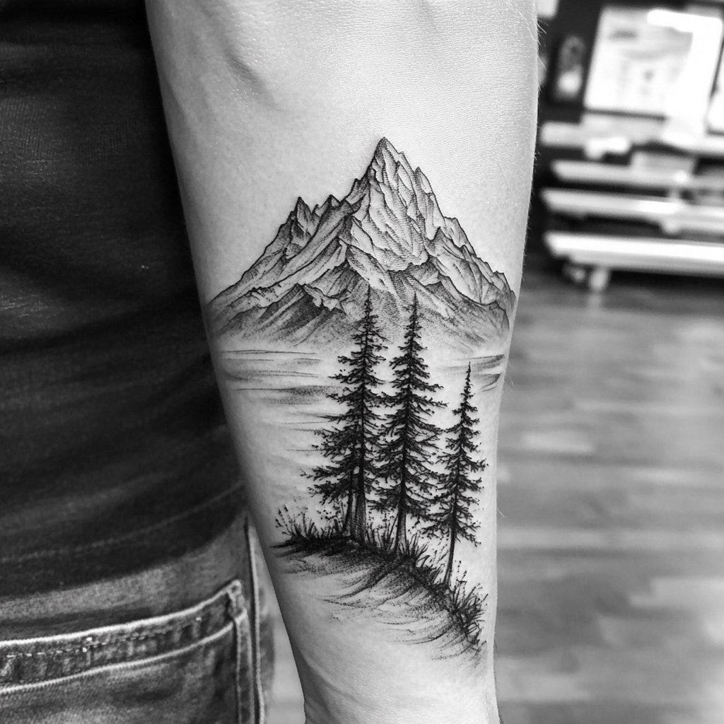 Создано на основе запроса: .Mountains and trees. On the lower arm , hyperrealistic.3d. 8k. Highly detailed .pencil drawing. Tattoo design. --- Автоперевод: .Mountaines и деревья. Необычно вышло? 🤔 https://dzen.ru/id/65c0c65c86e4f837c27b24d7 #ИИ #AI #нейросеть #midjourney #art