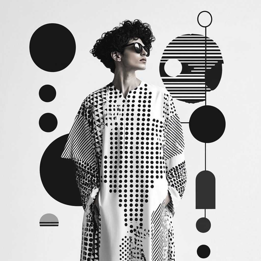 Создано на основе запроса: EDITORIAL SHOT OF MODEL WEARING KURTA HAVING PRINT A black and white geometric pattern with circles, semicircles, lines, boho shapes, and simple patterns layered on top of each other. The design is symmetrical and balanced, using clean vector graphics tthat evokes the mid-century modern style. --- Автоперевод: Редакционный снимок модели ношения курты с печати черно -белого геометрического рисунка с кругами, полукругами, линиями, форм бохо и простыми узорами, наложенными друг на друга. Неплохо выглядит? 🤔 https://dzen.ru/id/65c0c65c86e4f837c27b24d7 #ИИ #AI #нейросеть #midjourney #art